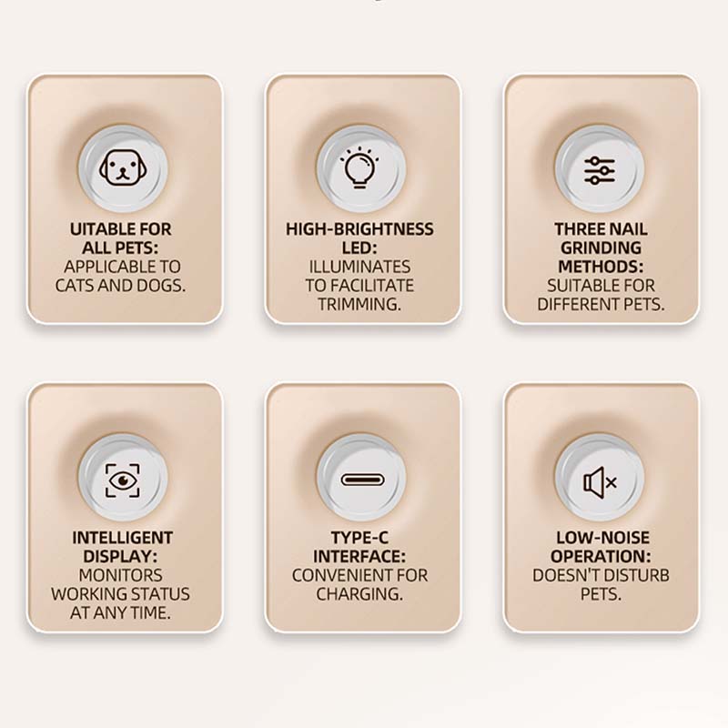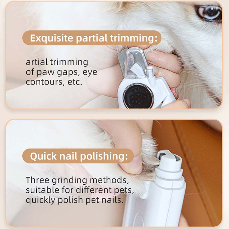 1. مصباح LED مدمج يوفر ضوء LED المدمج رؤية واضحة أثناء عملية التزيين، مما يمنع التشذيب العشوائي ويحمي فراء حيوانك الأليف من الإصابة. 2. مراقبة الشاشة الذكية شاشة ذكية تتعقب حالة التشغيل في الوقت الفعلي، بما في ذلك مستوى الطاقة ووضع التشغيل، مما يتيح لك فهم حالة الجهاز بنظرة سريعة. 3. وظيفة الطحن الاحترافية: رأس الطحن عالي الأداء يقوم بتلميع حواف الأظافر الحادة بسلاسة، مما يوفر لمسة نهائية مصقولة لطيفة تشبه صالونات التجميل للكلاب والقطط من جميع الأحجام. 4. شحن مريح من النوع C: تدعم واجهة Type-C العالمية الشحن السريع والسهل في أي وقت وفي أي مكان، مما يلغي مشكلة استبدال البطارية.